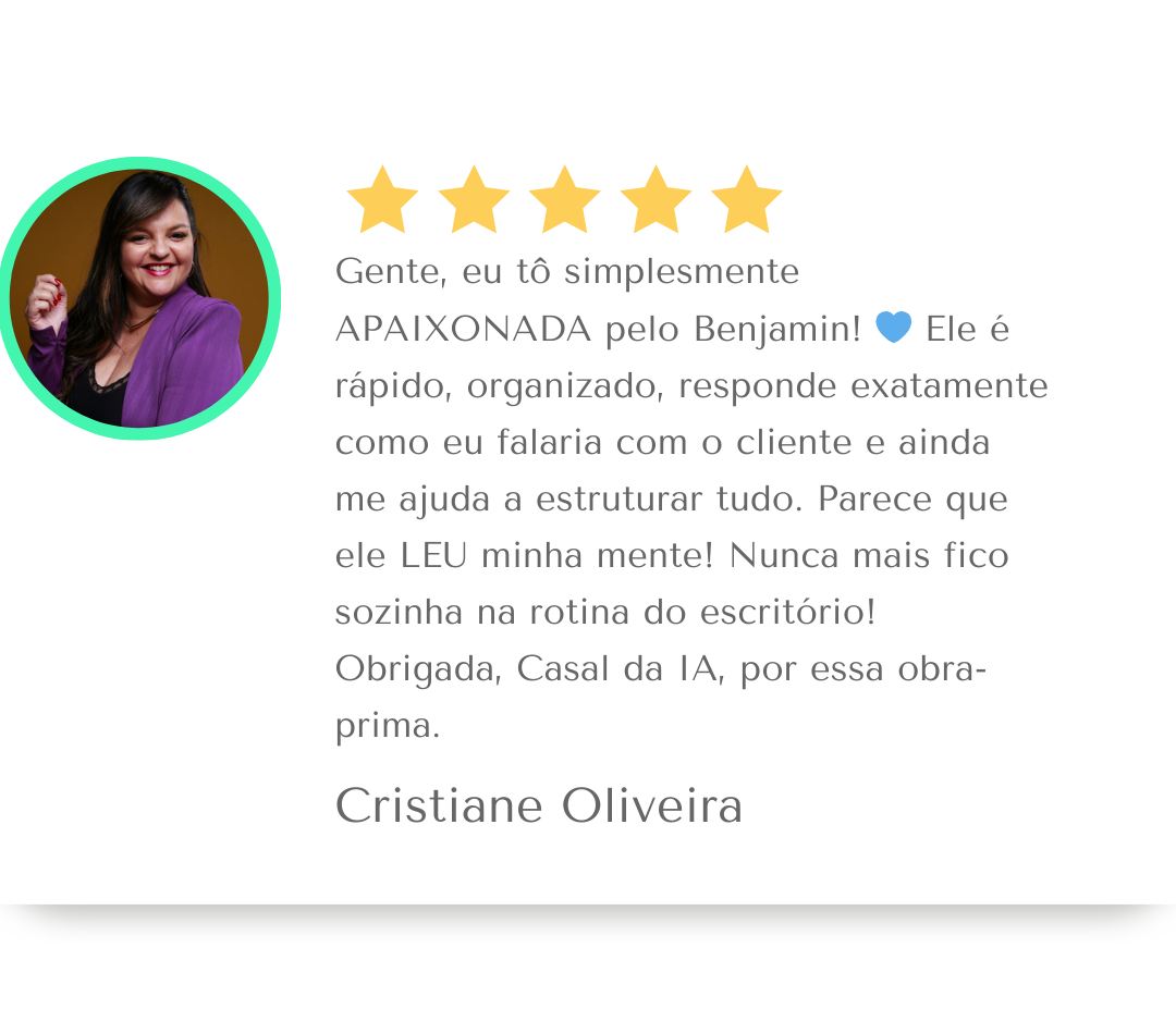 Você receberá na hora o Manual de Usabilidade com mais de 50 prompts prontos, estratégias aplicáveis e instruções práticas para começar a usar o Benjamin no seu escritório ainda hoje.
